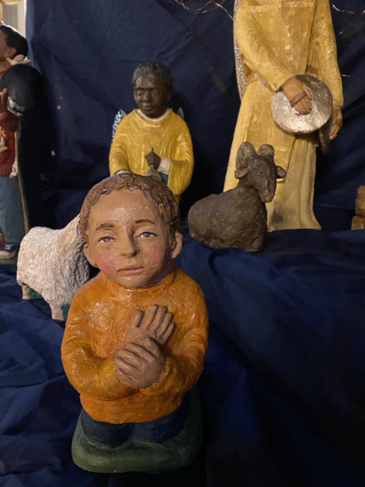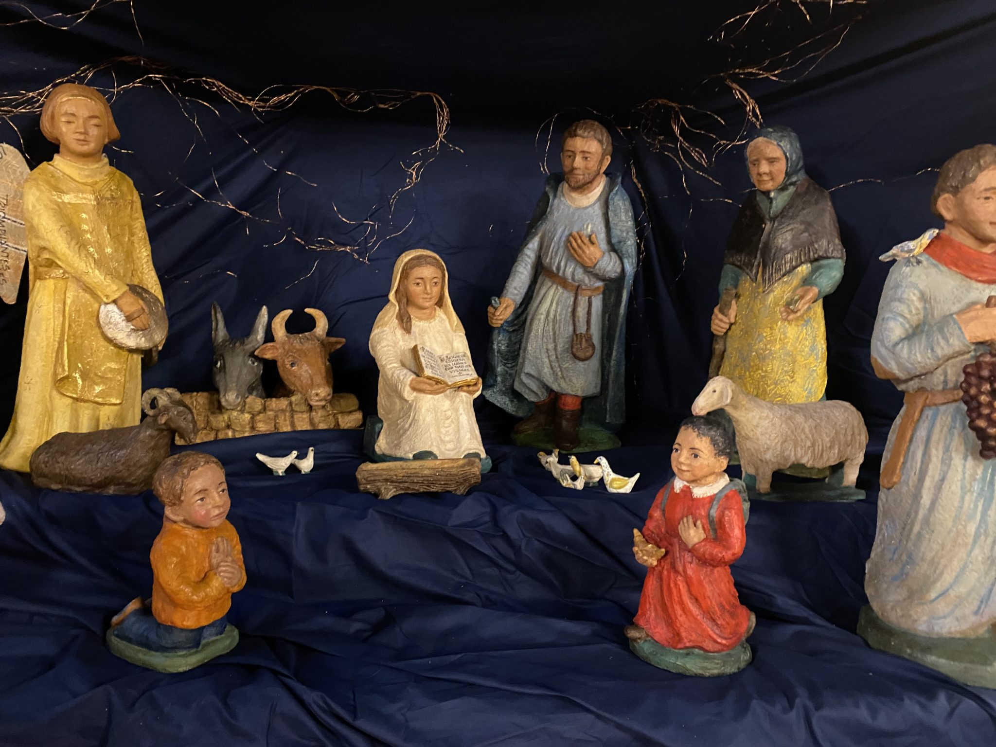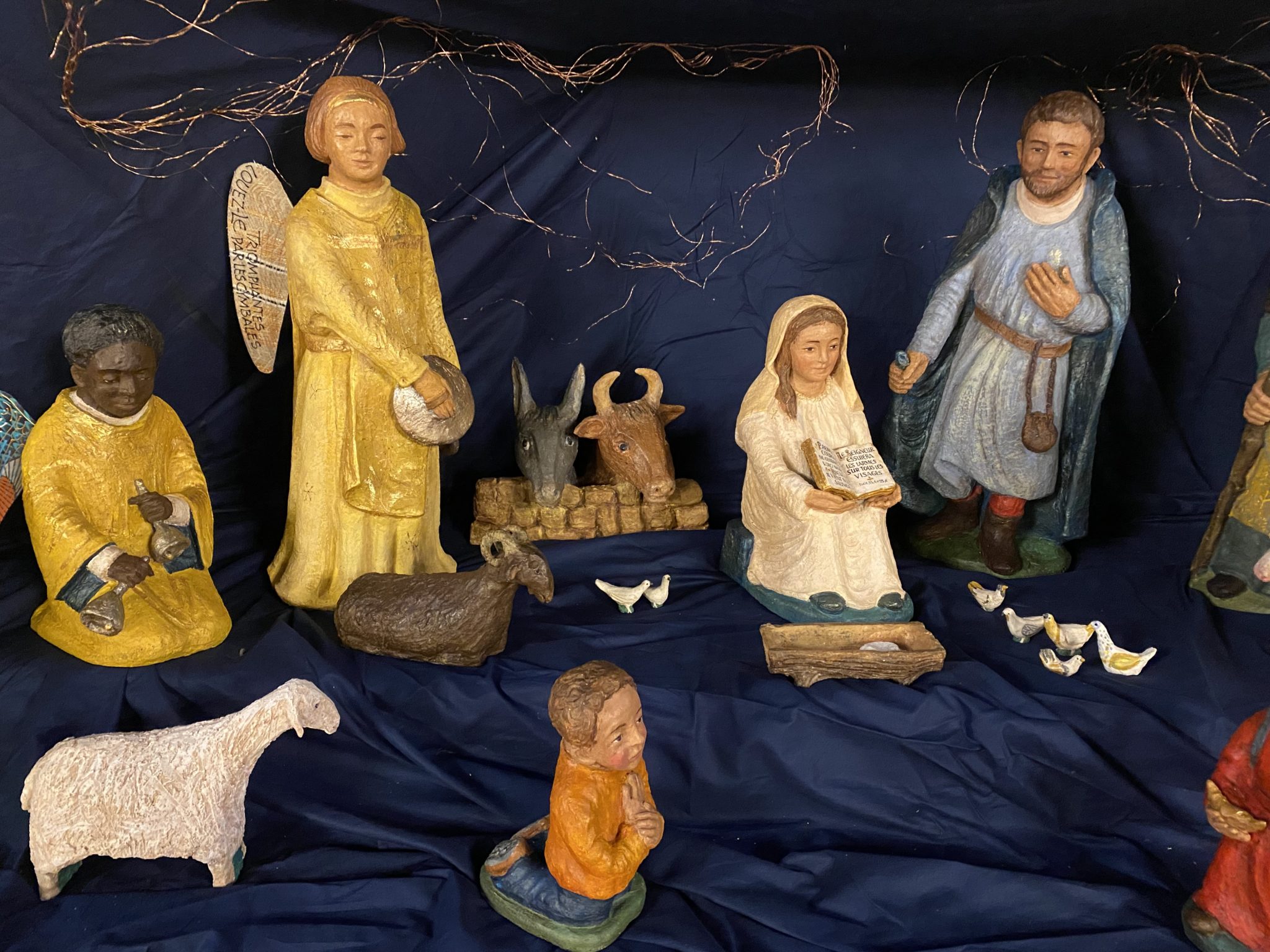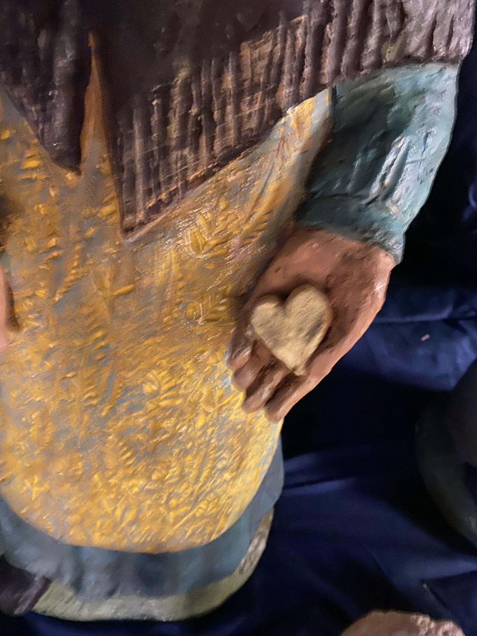Elle dessine dans la terre avec ses doigts l’ébauche de sa composition, les personnages se précisent peu à peu. La couleur donne son harmonie à l’ensemble. La patine apporte une finition chaleureuse.
