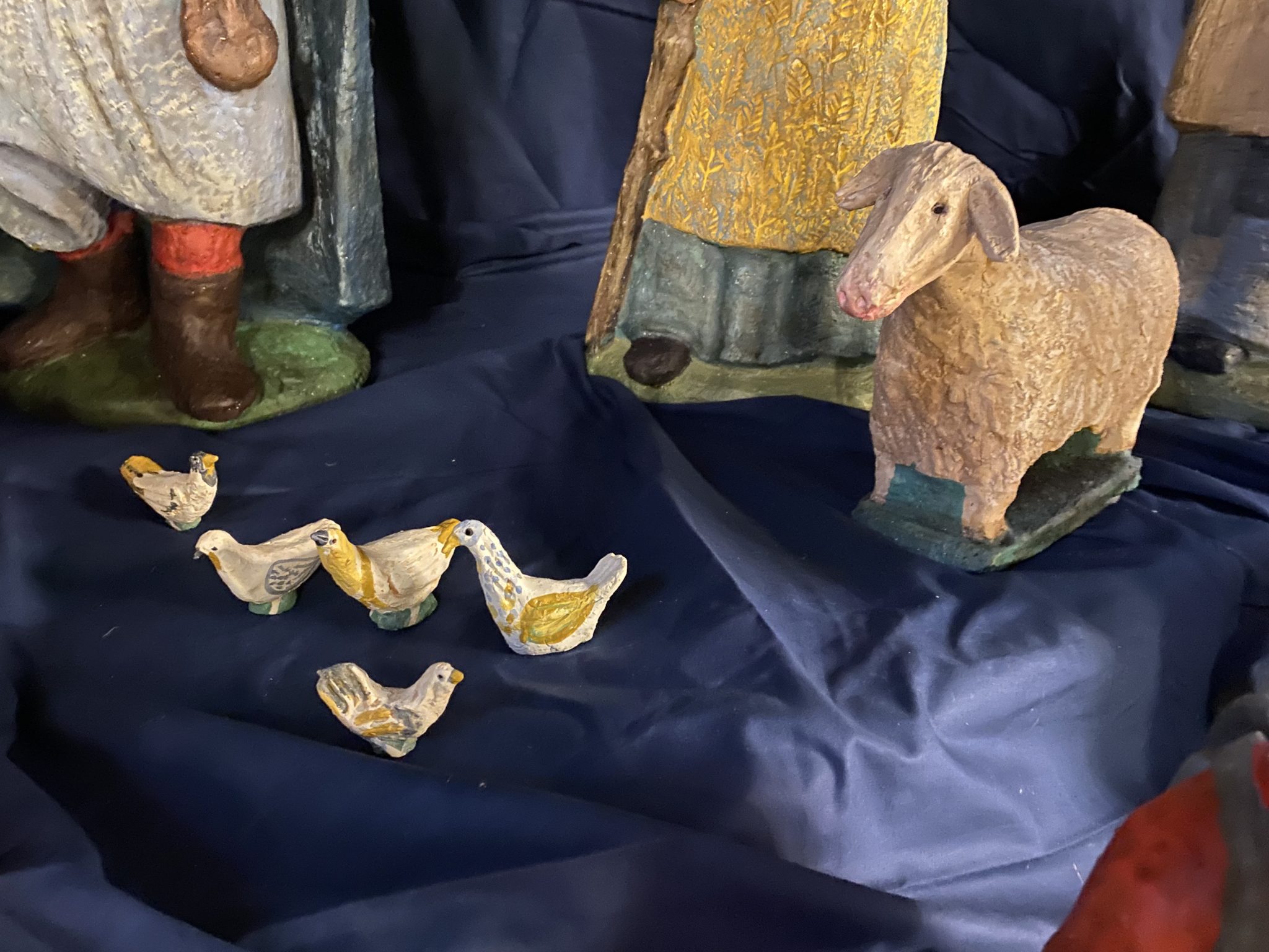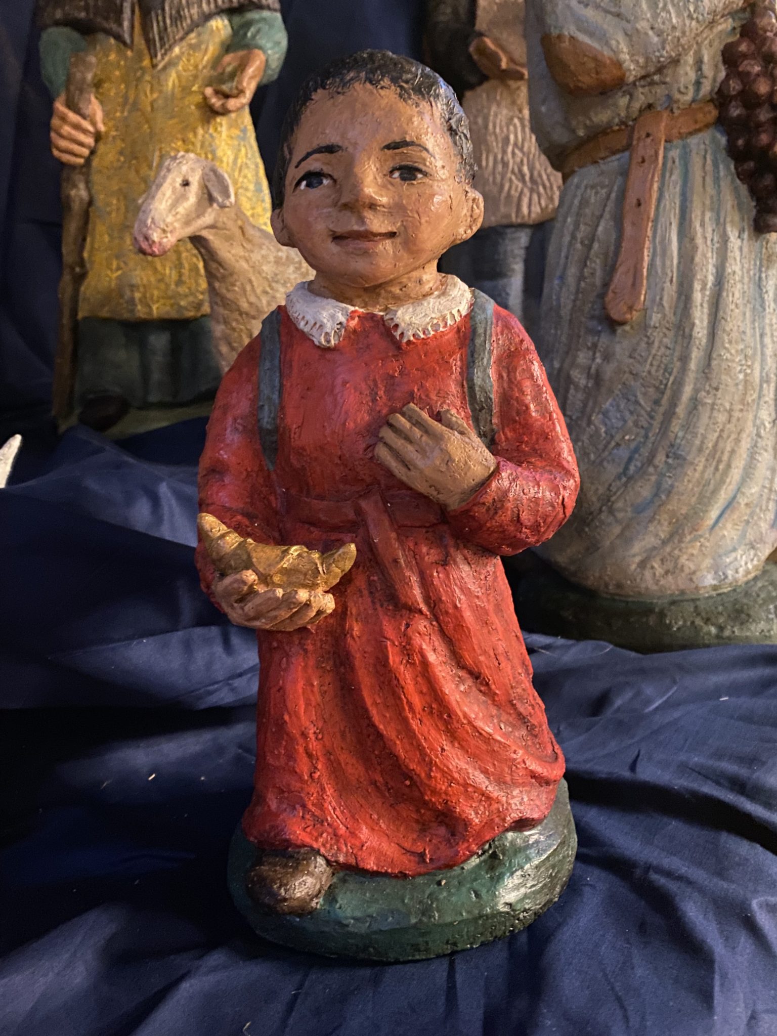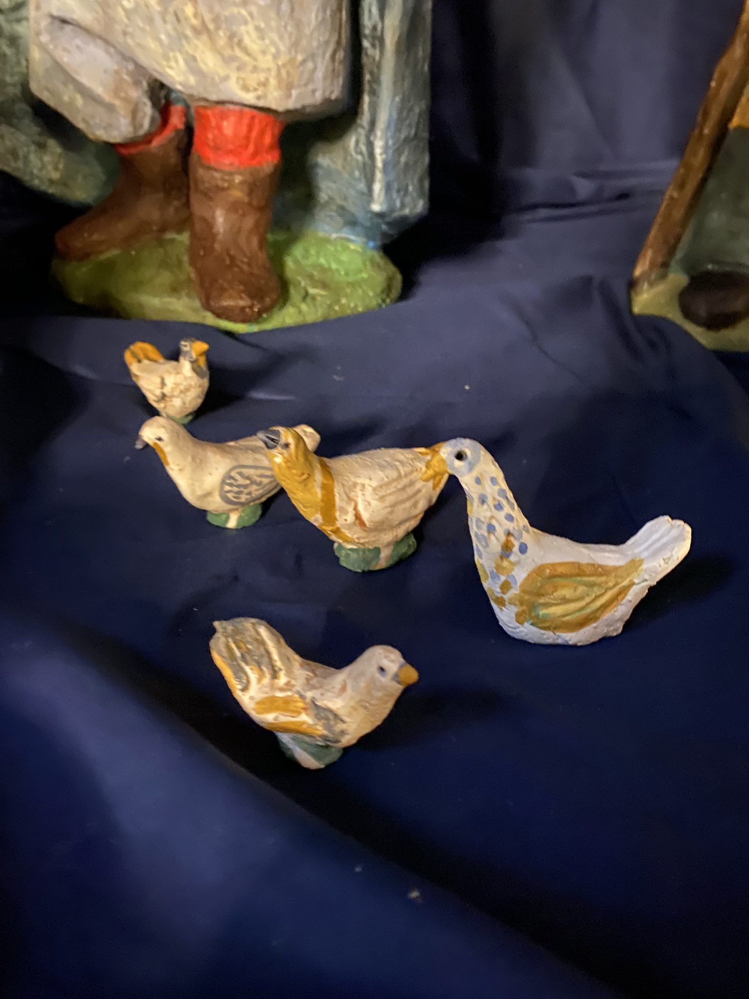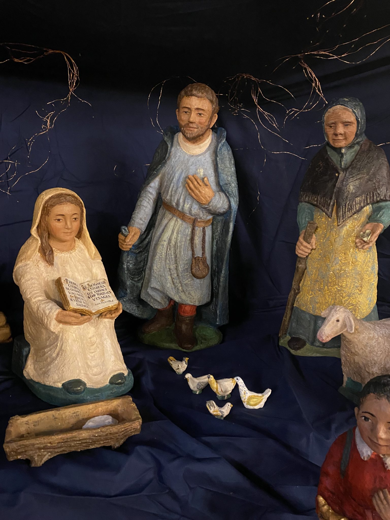 Elle dessine dans la terre avec ses doigts l’ébauche de sa composition, les personnages se précisent peu à peu. La couleur donne son harmonie à l’ensemble. La patine apporte une finition chaleureuse.